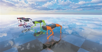 四足机器人正在不同地形进行步态训练。