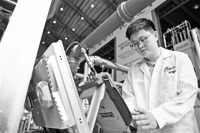 图为观众在展区观看中国科学院遗传与发育生物学研究所科研团队研发的世界首台可自动巡航杂交授粉育种机器人。本报记者 洪星摄