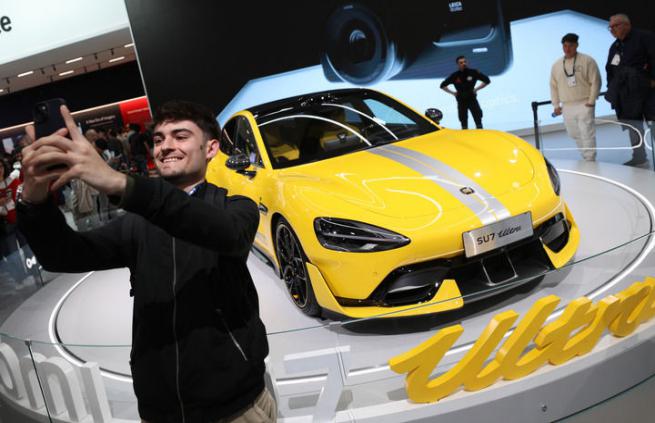 2025年3月6日,在西班牙巴塞罗那举行的2025年世界移动通信大会上,一名男子和小米汽车合影。新华社记者 赵丁喆 摄