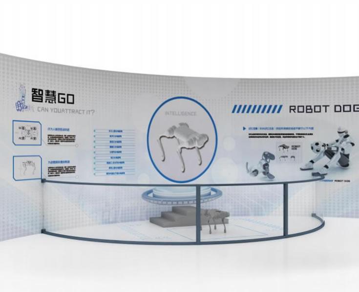 展项由一个训练场景和智慧狗组成。辅导员发出指令让智 慧狗完成避障和跳舞等动作。