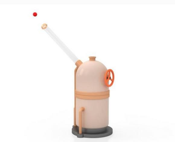 设计一个发射炮台和内置风机的弹射装置 ,在其正前方与 大联欢装置联动。观众将炮口调整对准目标 ,小球在风机的作用下被大炮抛掷。