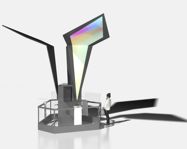 牛顿是第一个变出彩虹的魔术师,他率先使用三棱镜将白色的太阳光分散为七色光,发现了光的色散现象。展品主要由百合花造型的成像幕、三棱镜组件、平面镜组件、操作台、射灯等组成。其中射灯为固定光源,模拟太阳光效果。观众可以旋转台面上的旋钮来控制、调节三棱镜和平面镜的角度,会使成像幕上呈现相应的奇妙效果。