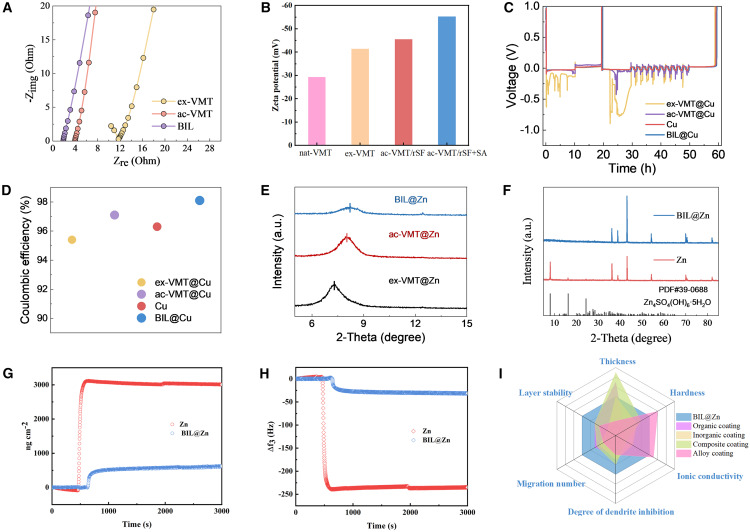 该成果受贝壳微观结构的启发,利用从天然蛭石和生物材料中提取的廉价、安全和绿色的原材料,在锌金属负极上构建了结构相似的仿生人工固体电解质界面层(Solid Electrolyte Interphase, SEI)。仿生人工SEI具有9.8 GPa的超高储能模量和超过0.5 GPa的平均硬度,在沉积过程中使锌枝晶在应力下屈服,有效地抑制了枝晶生长。此外,二维片状材料堆叠并且与生物聚合物相结合,形成选择性离子通道,可实现锌离子的高效快速传输。研究结果加深了锌负极溶解/沉积过程的力-电化学耦合认知,同时为金属负极的SEI结构设计提供了新的研究思路。