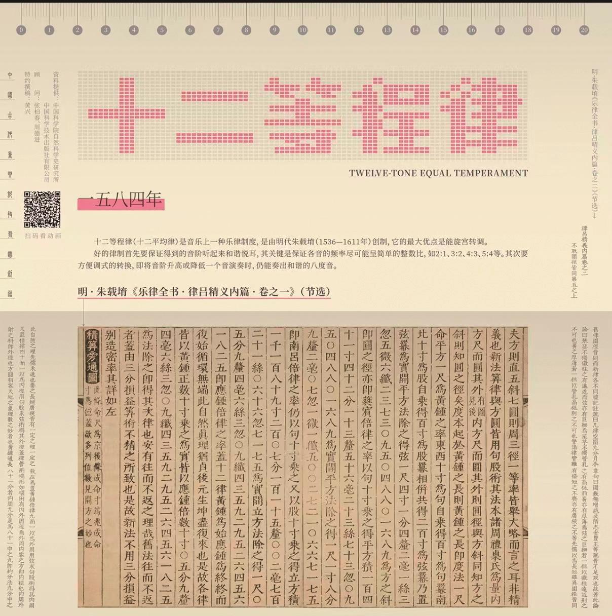 英国学者李约瑟称其为“中国文艺复兴式的科学巨人”,国际音乐学界公认其为十二等程律的发明者。巴赫的《等程律钢琴曲集》(1722年)常被视为该理论在西方实践的里程碑,而朱载堉的贡献则是在此一百多年前就实现了这一理论的奠基性突破。十二等程律,当是世界音乐理论的里程碑。