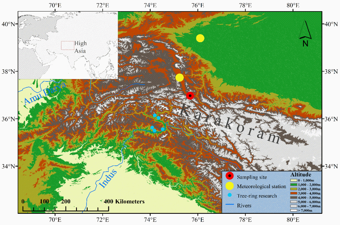 全球升温的背景下,全球高山冰川普遍呈现退缩趋势,但喀喇昆仑山脉的冰川却表现出异常的稳定性甚至扩张现象,这一现象被称为“喀喇昆仑异常”。先前对于喀喇昆仑异常现象的研究多是基于遥感手段来监测冰川活动,且低海拔的气候记录不能反映高海拔山地冰川的气候环境。
