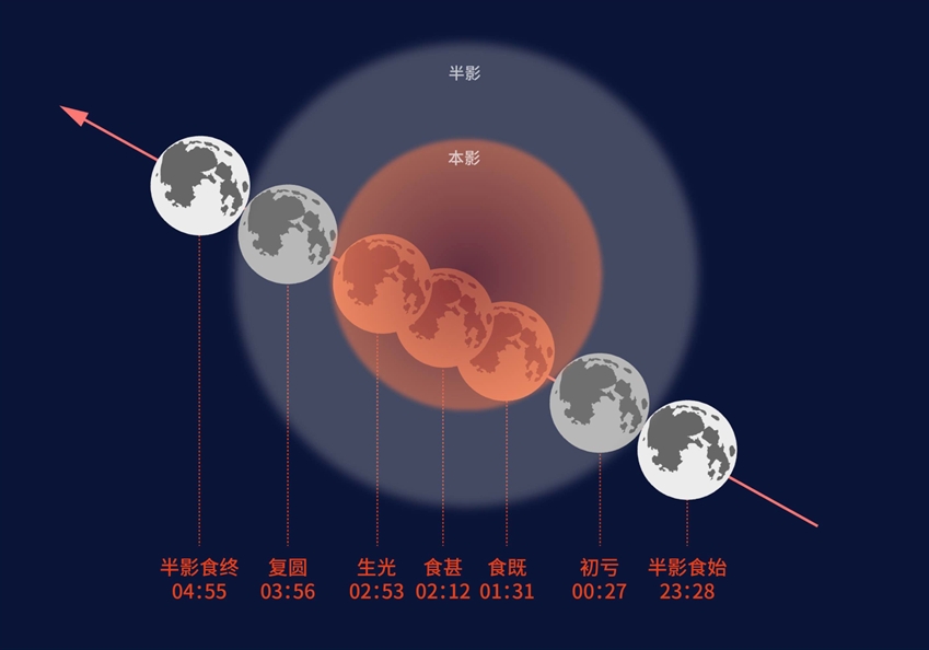 一次月全食按先后顺序有七个重要的时间点:半影月食始、初亏、食既、食甚、生光、复圆和半影月食终。