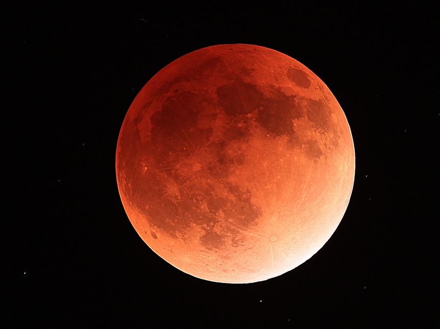 如果想拍摄红月亮的特写,还是有一定难度的,因为全食期间的月亮比正常的满月要暗得多。此时若想拍到月面合适的亮度,至少要曝光12秒。