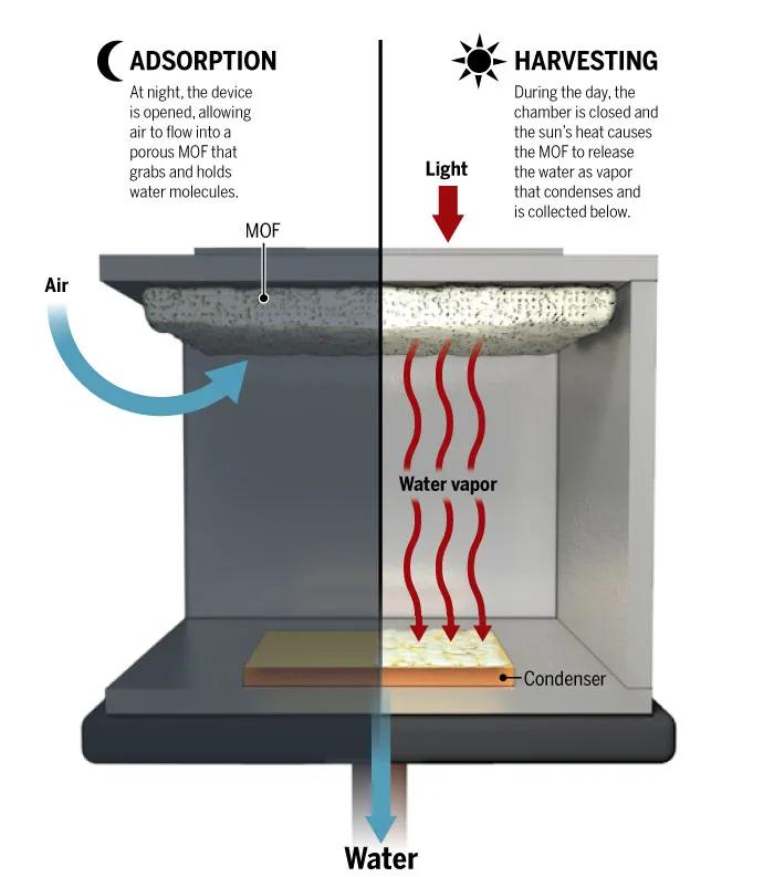 2014年,亚吉的研究小组展示了一项堪称“魔法”的实验:他们在亚利桑那州干燥的沙漠空气中收集到了水。在夜间,他们的MOF材料从空气中捕获水蒸气。当黎明来临,阳光加热材料时,液体水就出现了。因此称亚吉为“微观建筑界的贝聿铭”一点也不过分。
