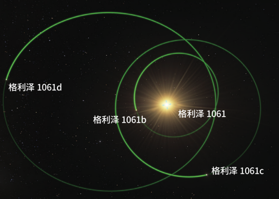 格利泽1061是一颗距离我们约12光年的红矮星,它的质量只有太阳的11.3%,接近恒星质量下限,光度仅有太阳的0.17%。不过,就在这样一颗暗弱的恒星周围,人类已经发现了3颗系外行星——格利泽1061b、c、d,质量分别是地球的1.38倍、1.75倍、1.68倍。图为这3颗系外行星的公转轨道示意图。其中只有格利泽1061d位于这颗恒星的宜居带内,它的公转轨道半径只相当于日地距离的1/20。由于格利泽1061的发光能力实在太弱,所以格利泽1061d能接收到的能量只相当于地球表面的60%,估计它的表面温度为-53℃。