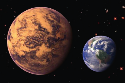格利泽667是一个位于天蝎座方向、距离我们约23.6光年远的三合星系统,组成这个系统的3颗恒星分别是太阳质量0.73倍、0.69倍和0.31倍的格利泽667A、B和C。其中在质量最小的红矮星格利泽667C附近已经确认发现了两颗系外行星,分别是格利泽667Cb和格利泽667Cc。其中格利泽667Cc位于宜居带的内侧边缘,它接收到的辐射能量比地球略多,表面温度也稍高于地球。不过已经确认这颗行星是被潮汐锁定的,在它的晨昏线附近有可能有一片狭长地带能够允许液态水的存在。图为格利泽667Cc(左)与地球的大小对比示意图。