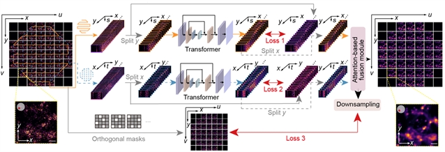 20251124日,清华大学团队在Nature Communications上发表文章Leveraging spatial-angular redundancy for self-supervised denoising of 3D fluorescence imaging without temporal dependency。该研究针对这一尚未决解的难题,研发了基于光场空间角度冗余性的自监督去噪算法LF-denoising,能够在自然光级的激发光下实现高速长时程高保真的三维成像。LF-denoising通过双路网络结构,利用光场的空间角度上高维复合冗余特征进行自监督去噪训练,从而避免了单一冗余对于数据保真度的破坏。研究团队针对性地考虑了实际长时间活体观测场景中常见的固定模式噪声、快速样本活动等问题,使得LF-denoising能够被在常见的样本和多种显微设备上,突破低光强下复杂噪声的成像环境限制。团队在仿真测试和斑马鱼心跳、斑马鱼胚胎、小鼠肝脏、小鼠脑皮层、果蝇脑等多种模式生物的活体实验中,验证了LF-denoising高保真的去噪能力,并在国际上首次实现了自然光级光毒性(10-μW/mm2)的长时程亚细胞分辨率三维荧光显微成像。
