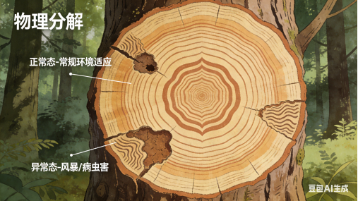 植物系统的生长规律,同样印证着物理分解的普适性。一棵树木的生长状态,本质上是正常态与异常态的叠加:树芯周围对称分布的年轮,是树木适应太阳辐射、水热条件等常规环境的正常态体现,少许均匀的不对称,也是环境常规变化的印记;而树干上的局部伤疤、年轮中的突变纹路,则是风暴、病虫害等外部突发强迫留下的异常态痕迹。通过物理分解,我们能清晰区分树木生长的“常规节律”与“突发干扰”,精准追溯每一处生长痕迹的物理成因——这正是物理分解破解系统混沌的核心能力:从杂乱的表象中分离出具有明确物理意义的正常与异常分量,让混沌变得“可解读”。