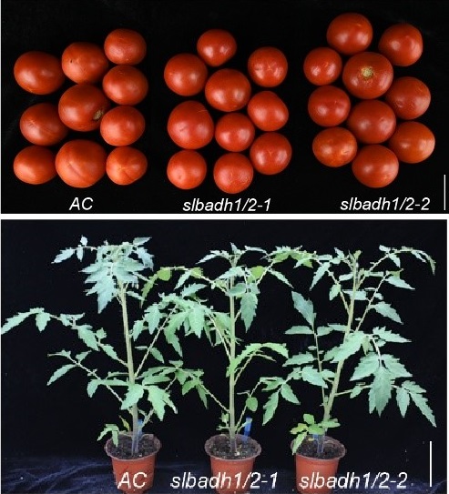 研究团队首先在番茄基因组中鉴定出两个BADH家族基因SlBADH1SlBADH2,并在番茄栽培品种中分别及同时敲除了SlBADH1SlBADH2。研究发现,单独敲除SlBADH2即可使番茄叶片和果实产生明显的“爆米花”香气,并且2-AP含量显著上升,表明SlBADH2是调控番茄2-AP合成的关键基因。