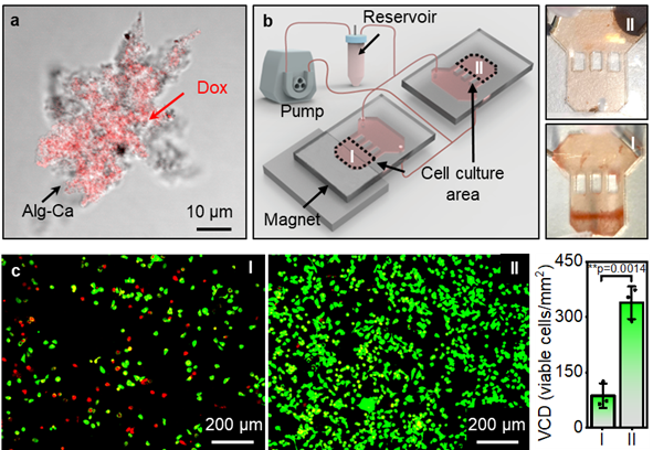 图4:在模拟人体血液循环系统的微流控通道中,顺磁性水凝胶可受外加静磁场调控实现精准药物靶向递送。