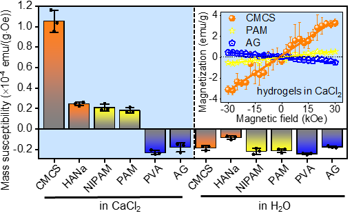 图2:多种水凝胶质量磁化率:富含羧基/酰胺基的羧甲基壳聚糖、聚丙烯酰胺和N-异丙基丙烯酰胺水凝胶,以及不含羧基/酰胺基的琼脂糖和聚乙烯醇水凝胶。插图为羧甲基壳聚糖、聚丙烯酰胺和琼脂糖水凝胶在CaCl2溶液中的M-H曲线。