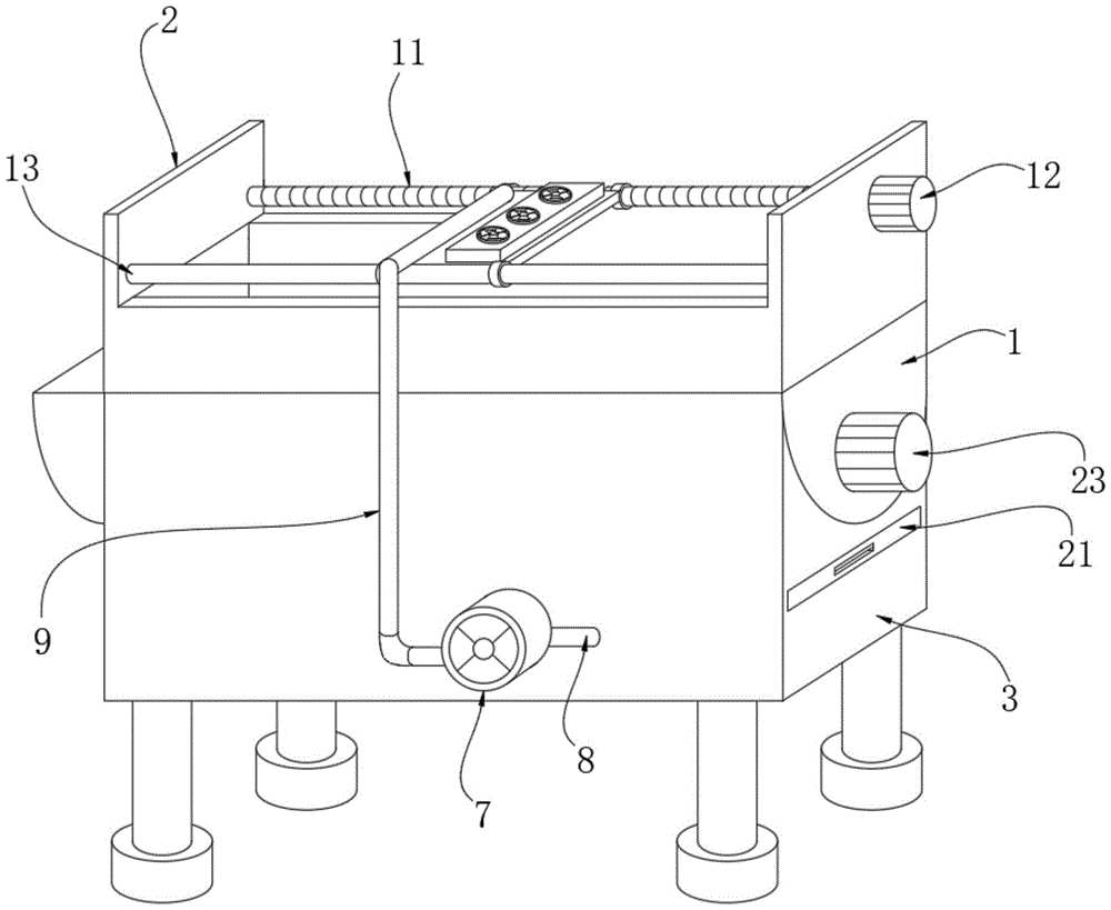 本实用新型公开了一种改性塑料快速降温装置,具体涉及改性塑料生产技术领域,包括混料箱,混料箱的顶部连通有加料框,且混料箱底部连通有降温水箱,混料箱一端的底部设置有排料管,排料管的底部设置有密封盖,混料箱底部的中心部位设置有排水管,降温水箱的表面设置有高压泵,高压泵输入端设置有连接管,高压泵输出端设置有输送软管,输送软管的底部设置有多个喷头,加料框的内部设置有烘干结构。本实用新型能够达到改性塑料的快速降温,而且能够对使用的水进行利用,减少浪费,同时,能够达到对降温后的塑料进行快速烘干操作,提高改性塑料的生产效率。