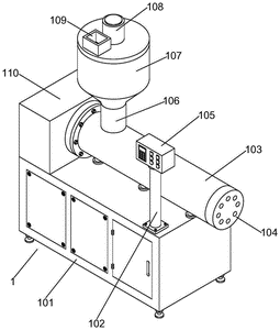 本实用新型涉及尼龙挤出机技术领域,具体为一种汽车用尼龙制备挤出机,包括挤出机主体,所述挤出机主体包括底柜,所述底柜顶部一侧固定安装有驱动箱,所述驱动箱一侧且位于底柜顶部通过支撑杆固定安装有挤出机箱,所述第一驱动电机输出端且位于挤出机箱内部连接安装有螺旋挤出杆,所述挤出机箱顶部靠近驱动箱的一侧通过进料管连接安装有进料仓,且所述进料仓内部设置有可控速控量的定量组件,通过设置定量组件,使得该汽车用尼龙制备挤出机可以方便有效的对挤出过程中尼龙材料的进入速度以及进入量进行控制,从而可以避免由于进入机箱内部的尼龙材料量过多造成堵塞,可有效避免对后续加工。