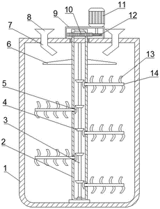 本实用新型涉及助剂混合技术领域,特别是一种尼龙生产用助剂混合装置,包括混料罐,在混料罐内设有搅拌机构,搅拌机构包括转动设在混料罐内的搅拌轴,在搅拌轴两侧壁上分别设有多个搅拌杆,在混料罐的顶部设有驱动搅拌轴转动的驱动机构,在驱动机构的两侧分别设有进料斗,在进料斗的底部连接有进料管,在搅拌轴的上端设有匀料机构,进料管的底部延伸至混料罐内,且进料管的出口朝向匀料机构。